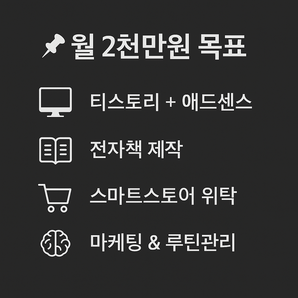 - 핵심 키워드: 티스토리 수익, 블로그 부업, 스마트스토어, 전자책, 수익형 블로그